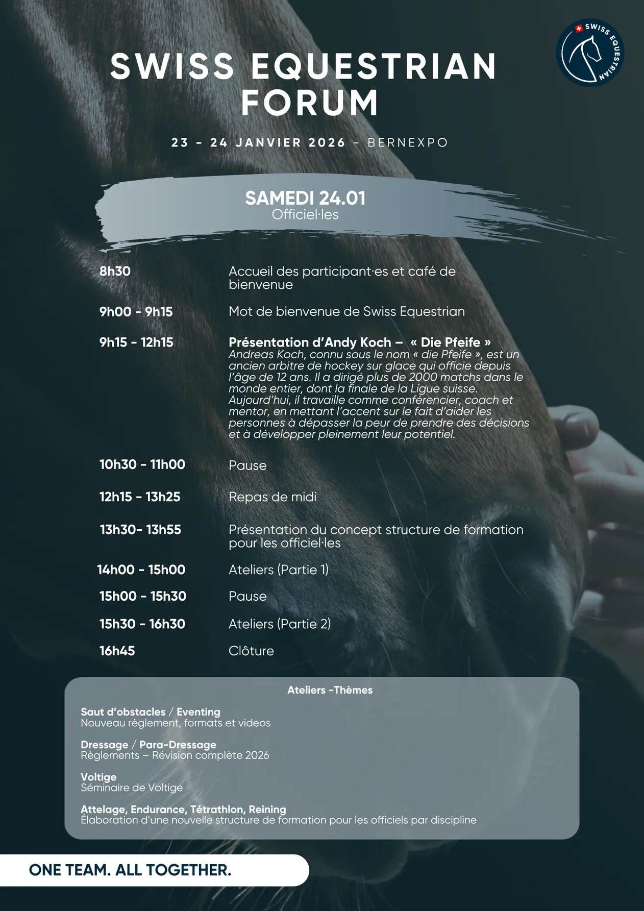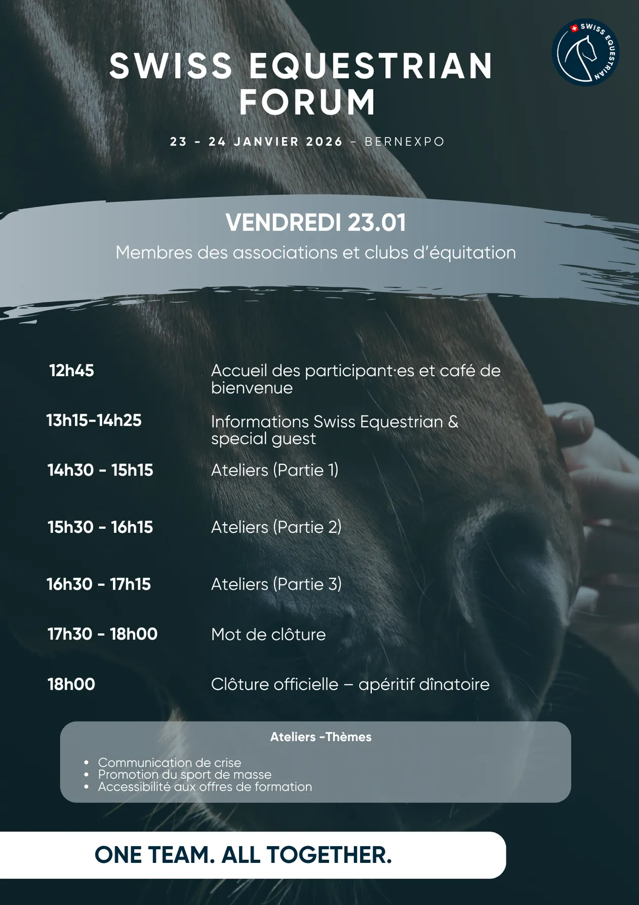 Nous avons réparti les participant·e·s le vendredi en trois groupes et le samedi par discipline et langue ; l’information concernant leur groupe leur sera communiquée au desk de check-in du Swiss Equestrian Forum.