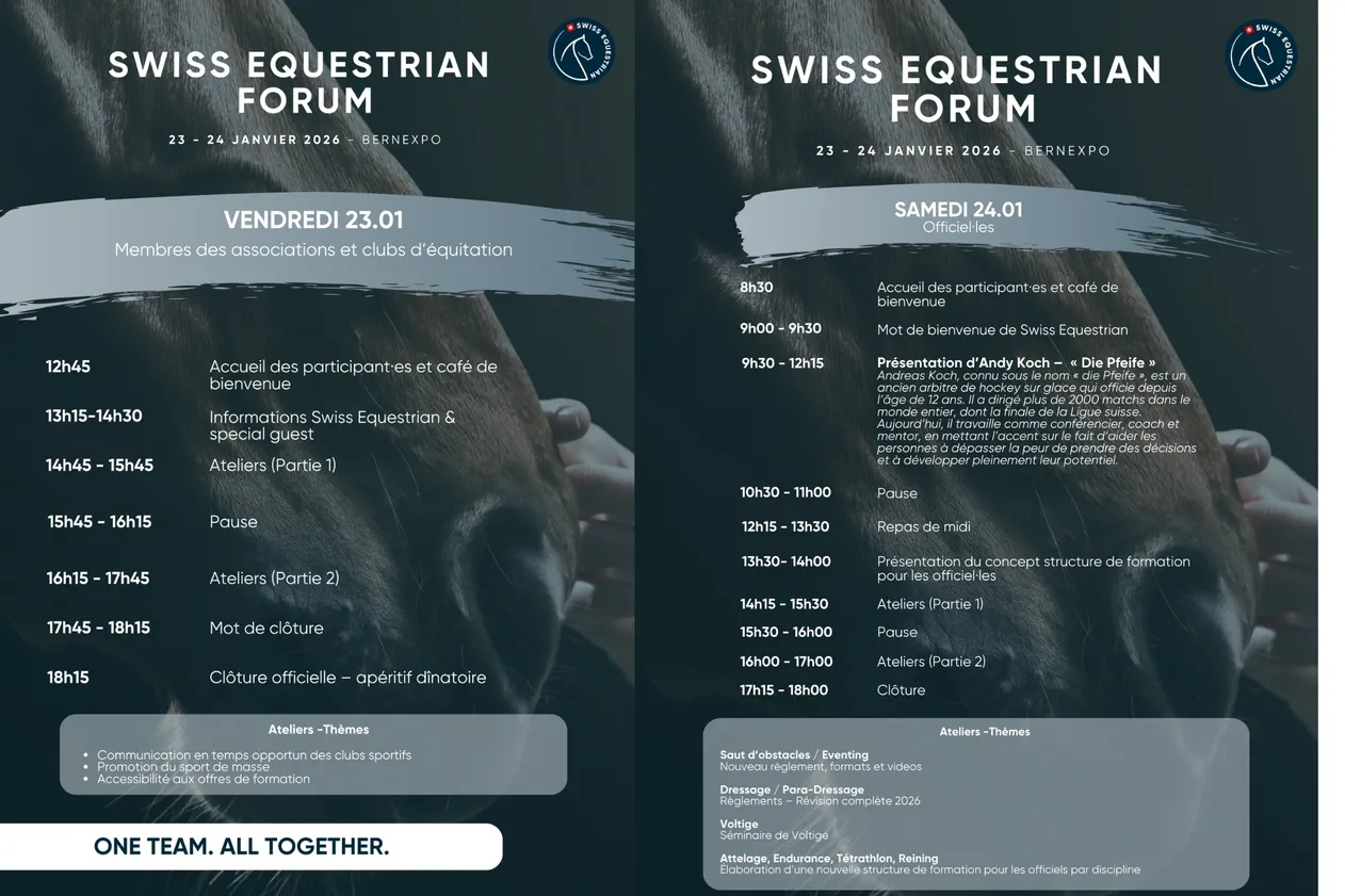 Bettina de RhamFormation et sport de masse +41 31 335 43 64 Contact Swiss Equestrian Forum 2026 23.01.2026 BernExpo, Festhalle, Papiermühlestrasse 50, 3014 Bern