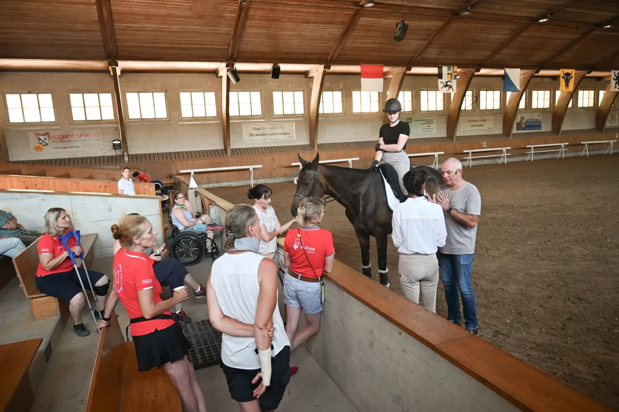 Quatorze cavalières et cavaliers ont bénéficié des conseils de Patricia Schärli, entraîneuse nationale de para-dressage, ou de Rolf Grebe, entraîneur de la relève allemande de para-dressage spécialement invité pour l’occasion. Chacun a été accompagné à son niveau : tandis que la sportive d’élite et multiple participante paralympique Nicole Geiger peaufinait, avec son Donar Weltino, les derniers détails en vue du prochain championnat d’Europe à Ermelo (NED), d’autres profitaient de ce cadre professionnel pour franchir, pour la première fois, le pas entre l’hippothérapie et l’équitation sportive. Les regards pétillants de tous reflétaient la joie et l’émotion partagées.