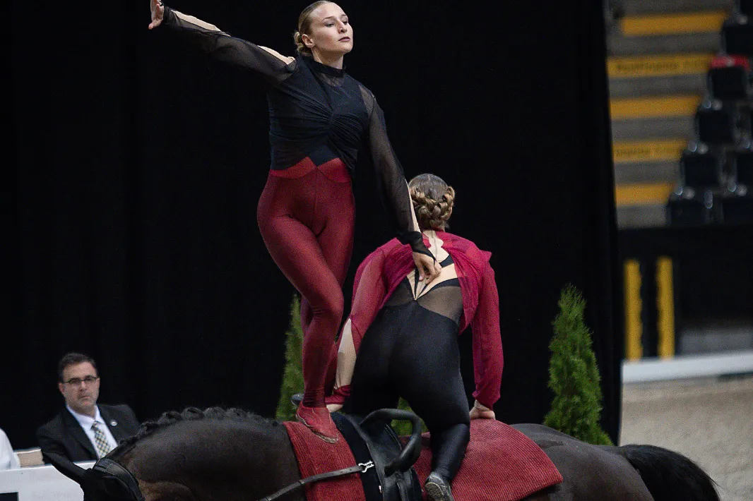 Im Voltige verbinden sich Kraft, Eleganz und Harmonie auf ganz besondere Art und Weise. Im Einklang mit dem Pferd vollbringen die Athletinnen und Athleten akrobatische Höchstleistungen auf dem Pferderücken und bewegen sich dazu mit Leichtigkeit zum Rhythmus der Musik. Im Pas-de-deux, wie der Name schon sagt, wird zu zweit geturnt. Das Schweizer Duo Zoe Maruccio und Syra Schmid aus Bern haben es in dieser Kategorie zur Weltklasse geschafft – ein Erfolg, der nur dank intensivem Training und blindem Vertrauen zwischen den beiden Athletinnen und zu ihrem treuen vierbeinigen Partner Latino vom Forst CH mit Longenführer Michael Heuer möglich ist.