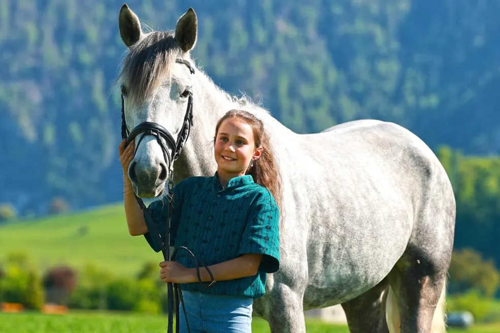 Am Montag reite ich nicht, weil ich den ganzen Tag Schule habe und danach ins Schwimmtraining und ins Turnen gehe. Ansonsten reite ich jeden Tag, auch am Wochenende – insgesamt etwa 12 bis 18 Stunden pro Woche. In den Ferien natürlich noch mehr. Ich trainiere Dressur, Cross und Springen, gehe aber auch oft ausreiten. Einmal pro Woche arbeiten wir die Pferde an der Longe und am Boden.